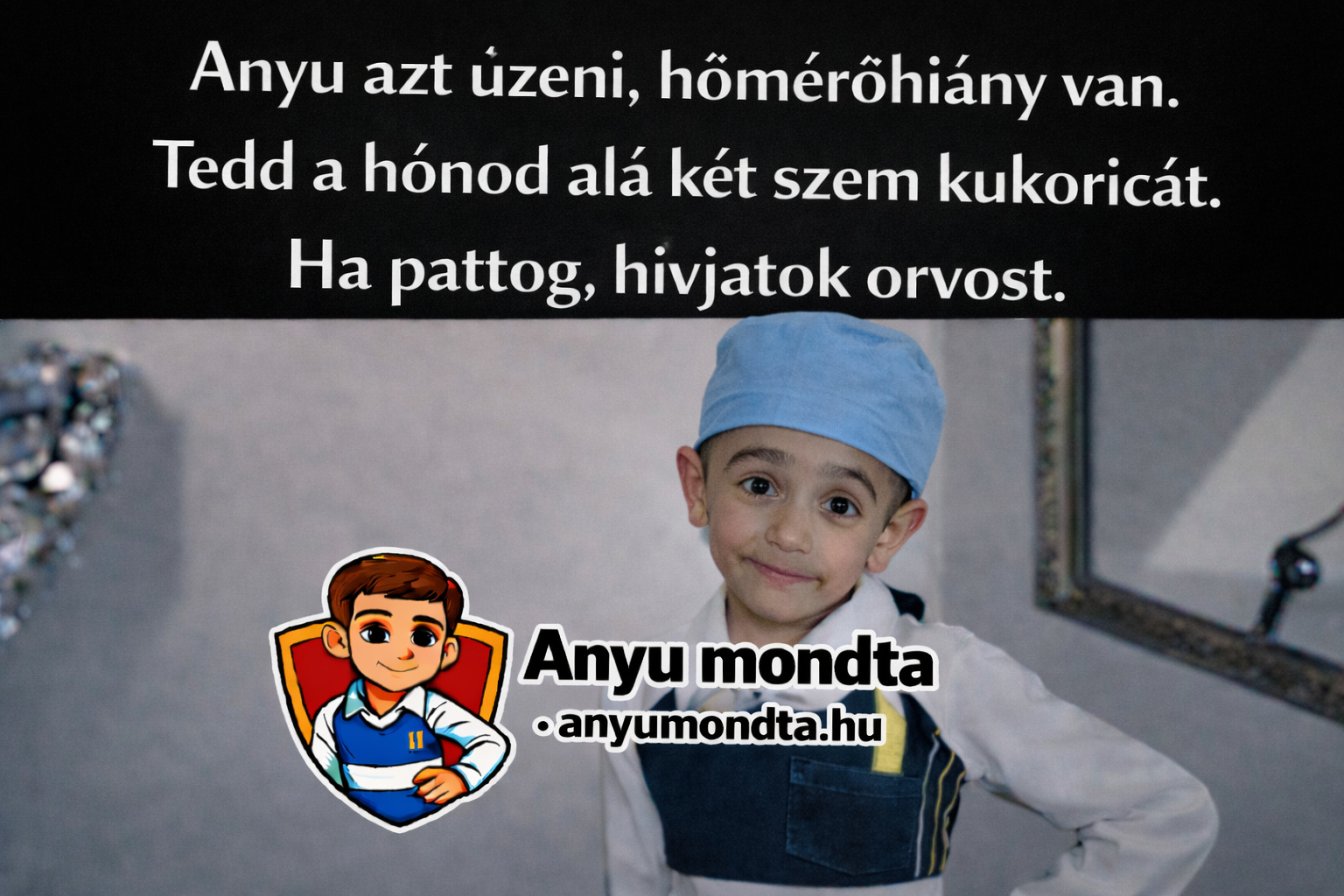 A képen egy fiatal fiú látható jellegzetes, kissé félmosolygós arckifejezéssel, régi hangulatú beltéri környezetben. A fotó fölött humoros felirat olvasható „Anyú üzeni” stílusban, amely egy hosszú házasság utáni, hétköznapi, mégis csattanós párkapcsolati poént fogalmaz meg. A kép egyszerre nosztalgikus és ironikus, a magyar falusi humor jól ismert elemeivel, könnyen azonosulható, megosztásra ösztönző formában.